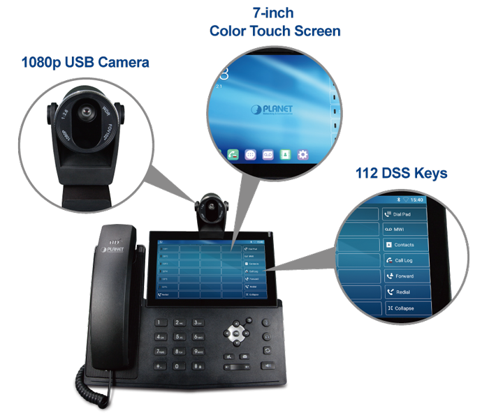 Up to 20 SIP lines with 112 one-touch DSS keys on the 7-inch color touch screen, built-in Bluetooth 4.2 and 2.4G/5G wireless make daily communication smarter and simpler. Matching a optional 1080p USB camera , the ICF-1900 can deliver a superb audio and video for group conferencing.