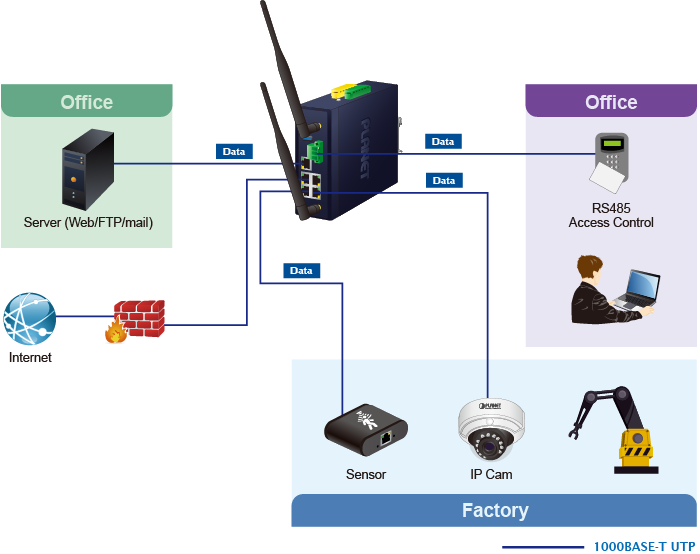 PLANET IVR-300W can work as a VPN security gateway in an industrial application for a company that has a factory and many different divisions. With IPSec/GRE/PPTP/L2TP/SSL VPN solutions, the IVR-300W installed at the headquarters provides branches, vendors, and mobile workers with secure data communication no matter how long the distance would be.