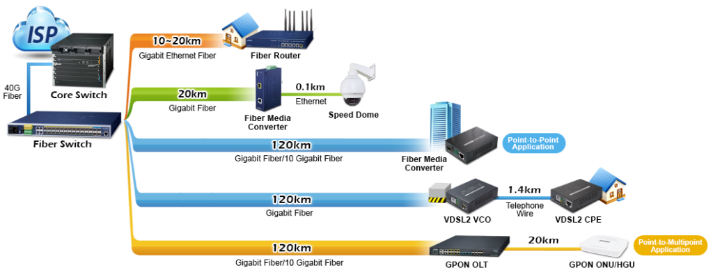 In the broadband communication, fiber optic technology has become the mainstream for communities and telecom transmission deployment as it fulfills the cloud application, high-demanding multimedia streaming needs and a transmission distance of up to 120km. To satisfy the demand of the FTTx infrastructure, PLANET has come out with a complete product line of Fiber Switches, Fiber Routers, Metro Fiber Switches, Commercial and Industrial Media Converters, GPON/ GEPON OLT, GPON/ GEPON ONU, and PoE Media Converters. PLANET also provides a combined CO and CPE VDSL2 solution to meet the last mile transmission requirements.